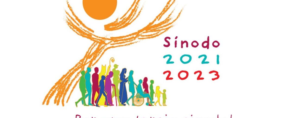 A linha de base horizontal: “Por uma Igreja sinodal: comunhão, participação e missão” vai da esquerda para a direita no sentido de uma marcha, sublinhando e reforçando-a, terminando com o título “Sínodo 2021-2023”: o ponto culminante que resume tudo.